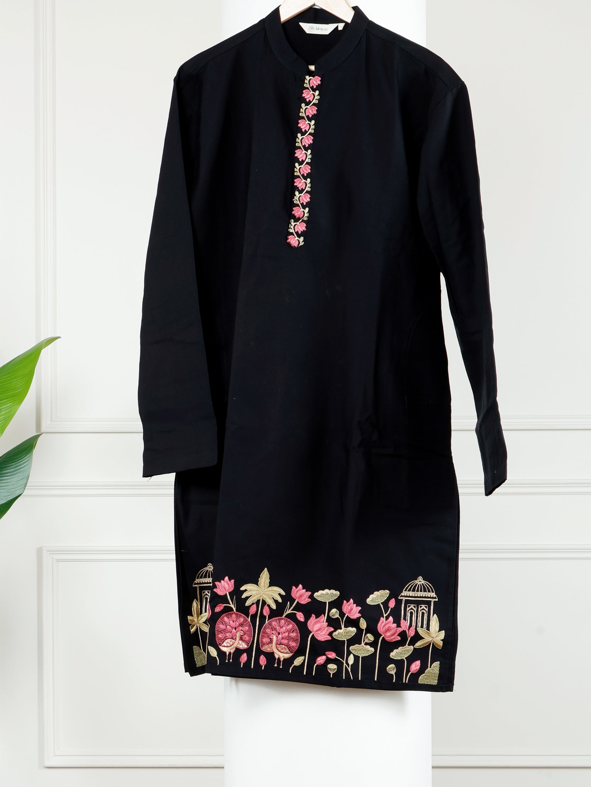 Elevate your ethnic wardrobe with this elegant Black Bloom Embroidered Cotton Kurta for men. Crafted from lightweight and breathable cotton, this kurta features a Classy Black colour exudes calm sophistication and style. The neckline is adorned with delicate floral embroidery in vibrant shades of pink and green, adding a refined touch of charm.