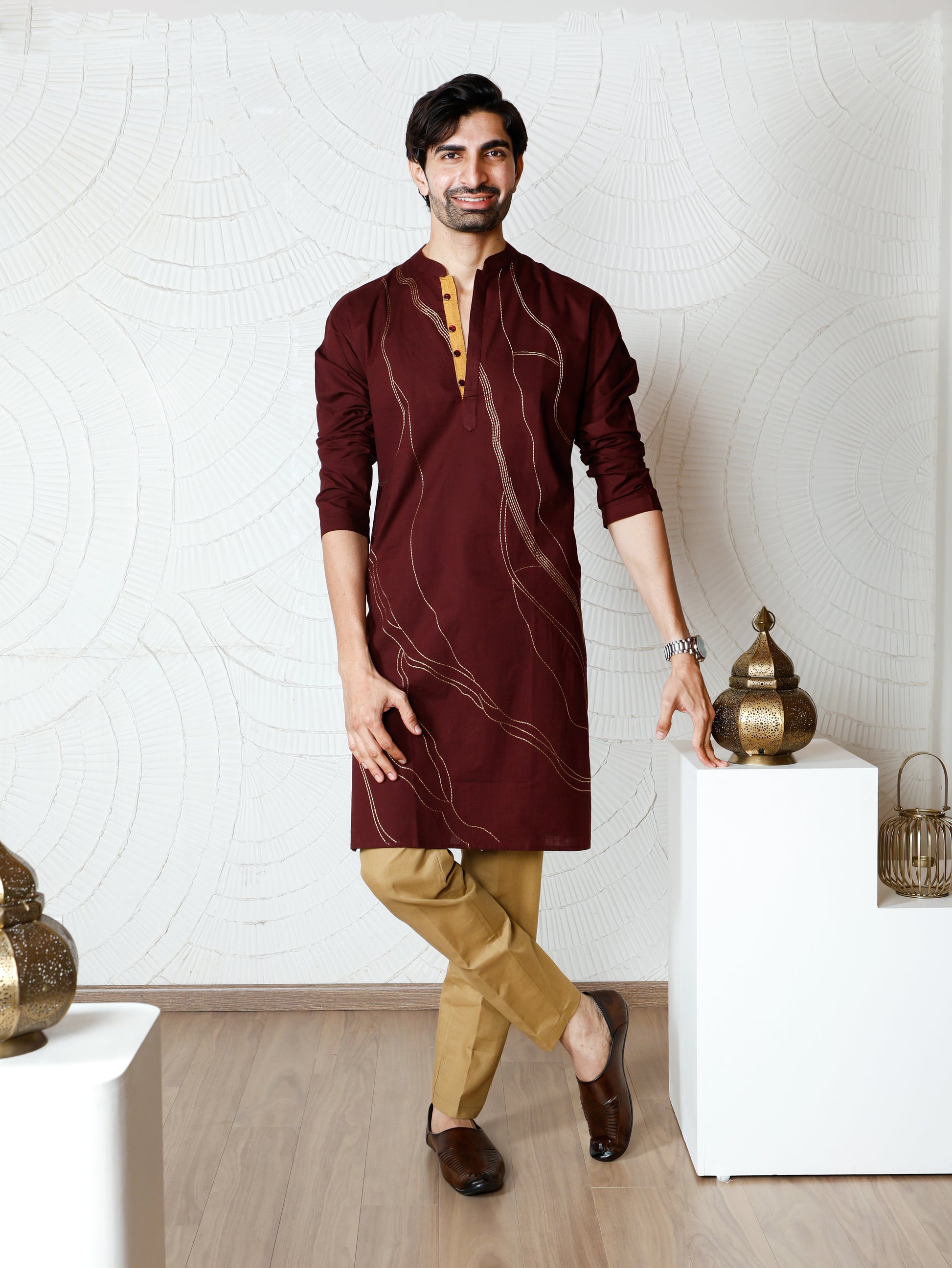 This men's kurta and pant set is named as "Burgundy Thread weave Kurta".