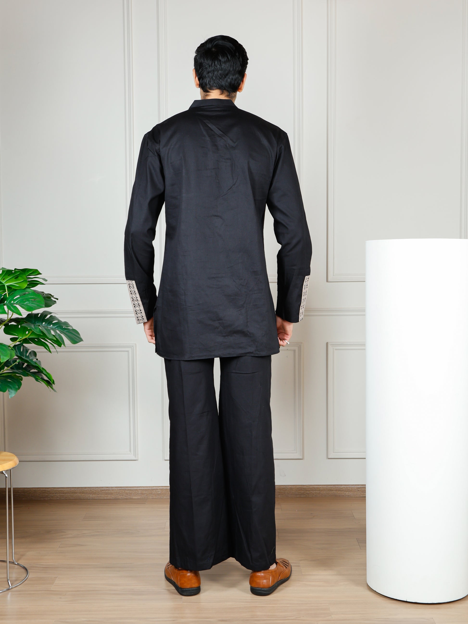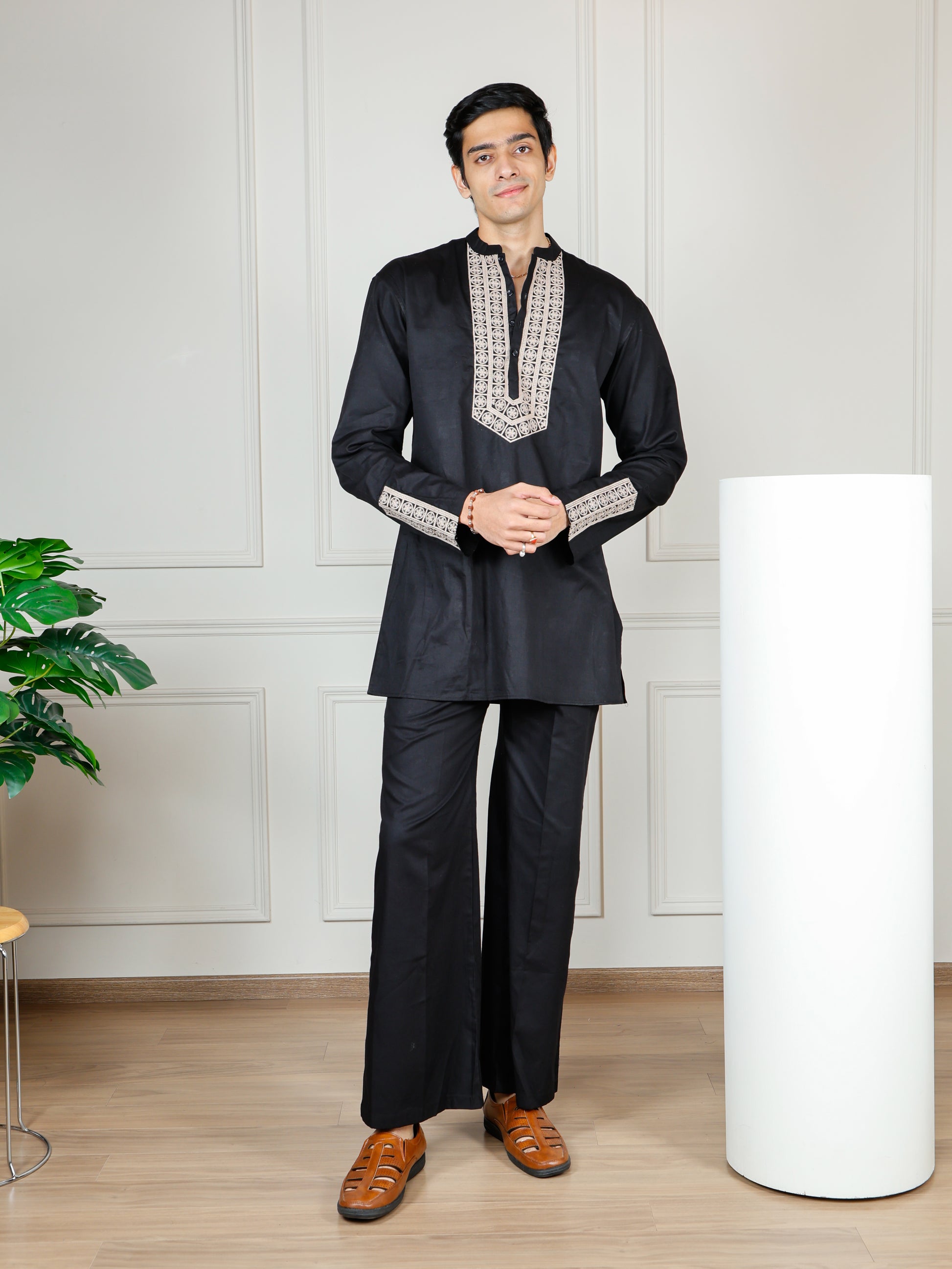 Elegant Black Men’s Kurta Set with Intricate Embroidery