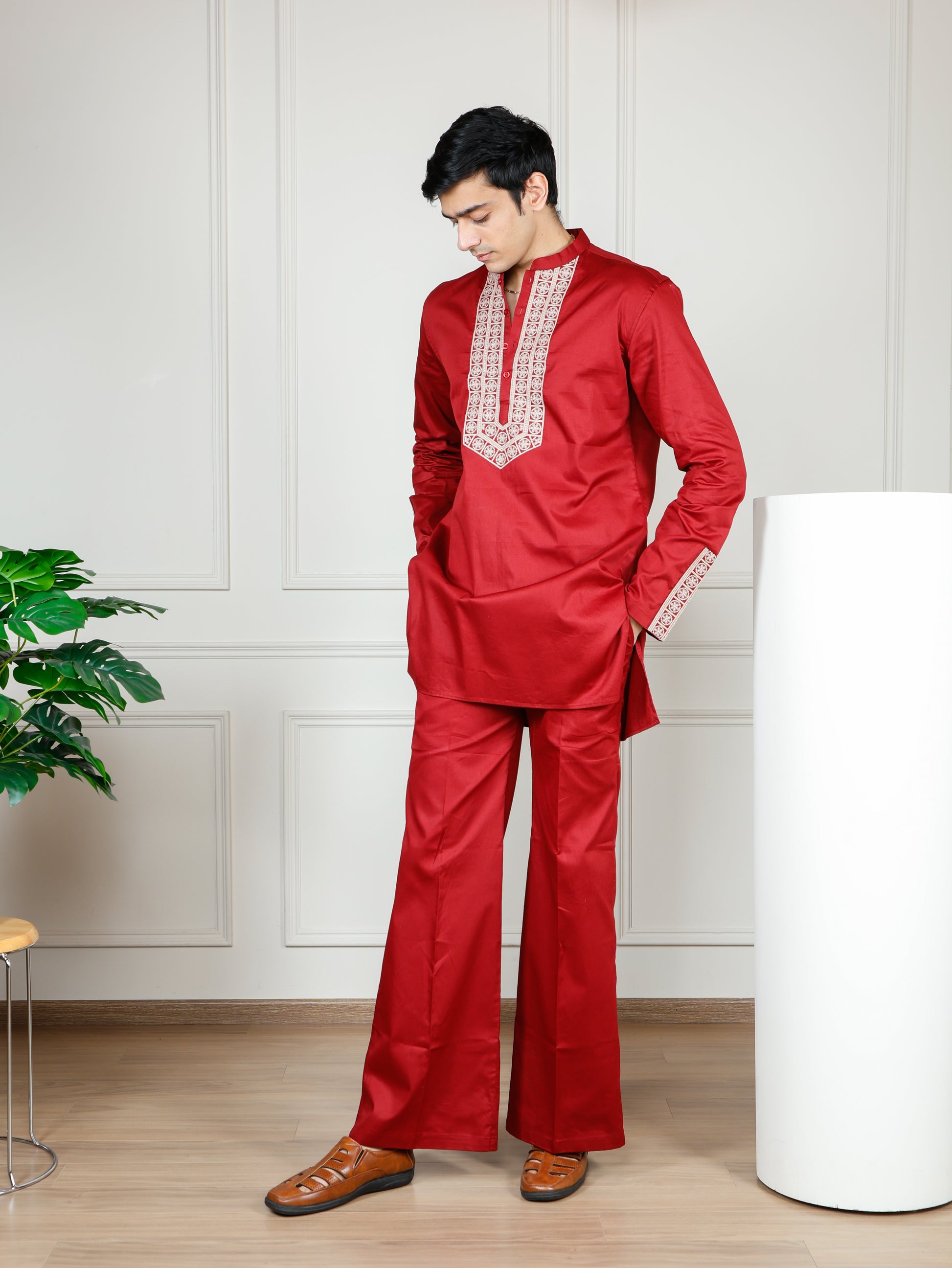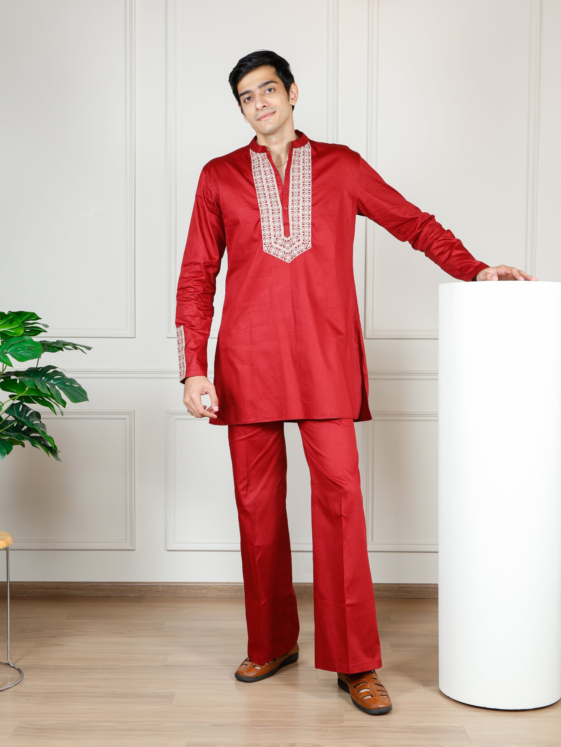 Elegant Maroon Men’s Kurta Set with Intricate Embroidery