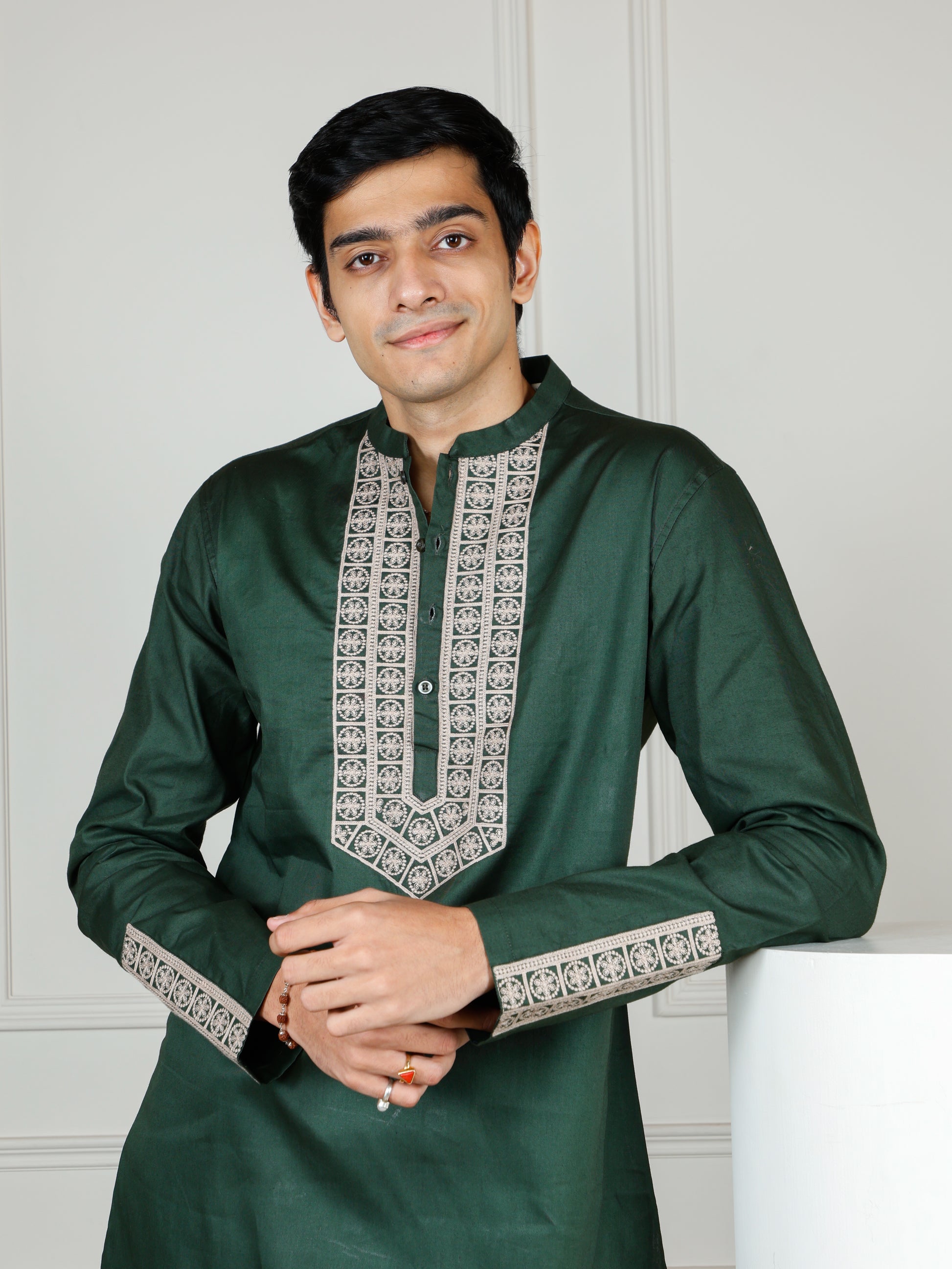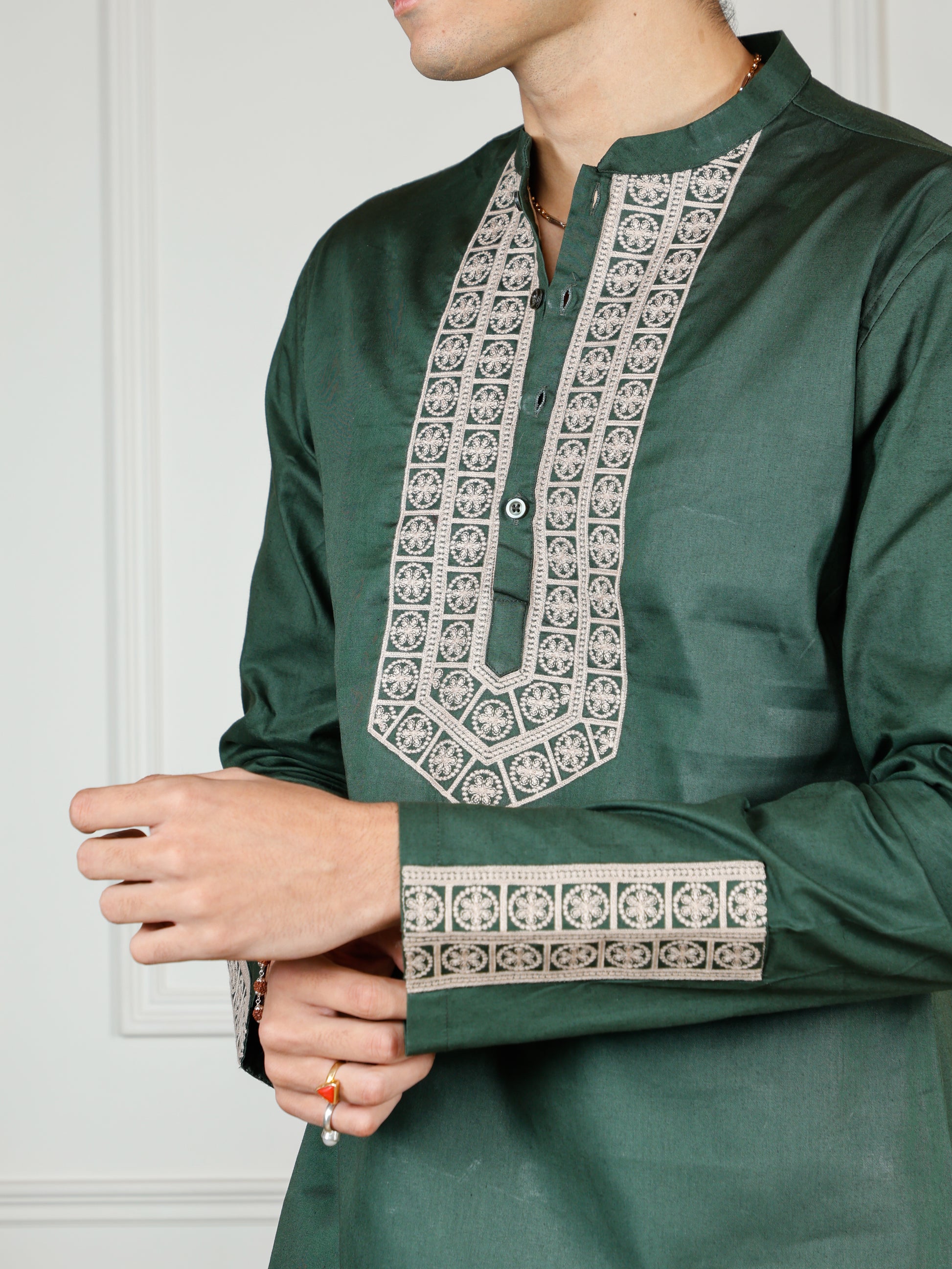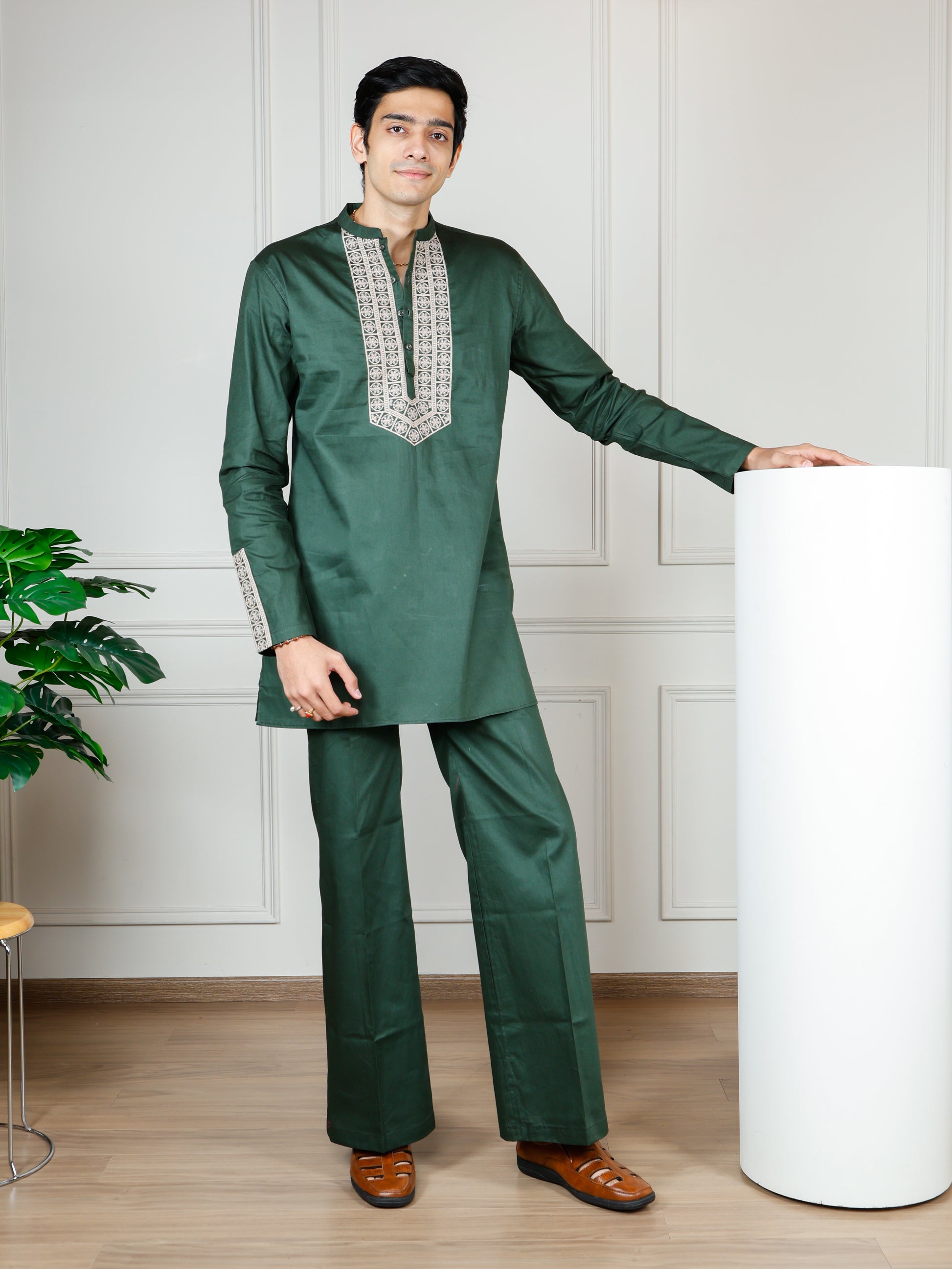 The standout feature of this kurta is the intricate beige embroidered detailing along the mandarin collar, button placket, and sleeve cuffs, adding a sophisticated touch of heritage-inspired artistry. The full-sleeve design and relaxed fit offer ease of movement, while the straight-cut matching pants provide a seamless, classic silhouette.