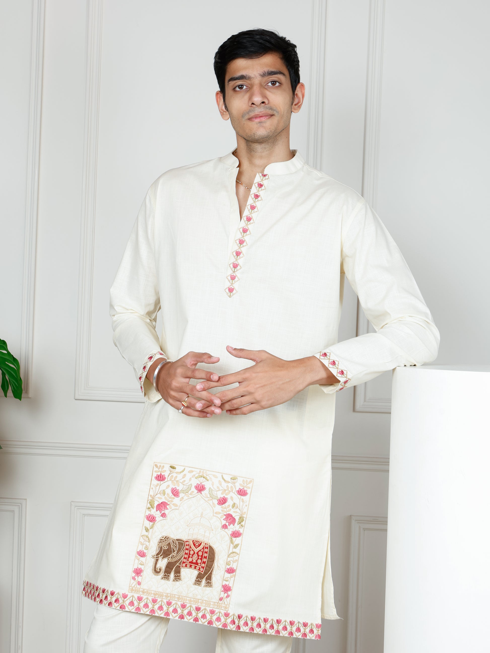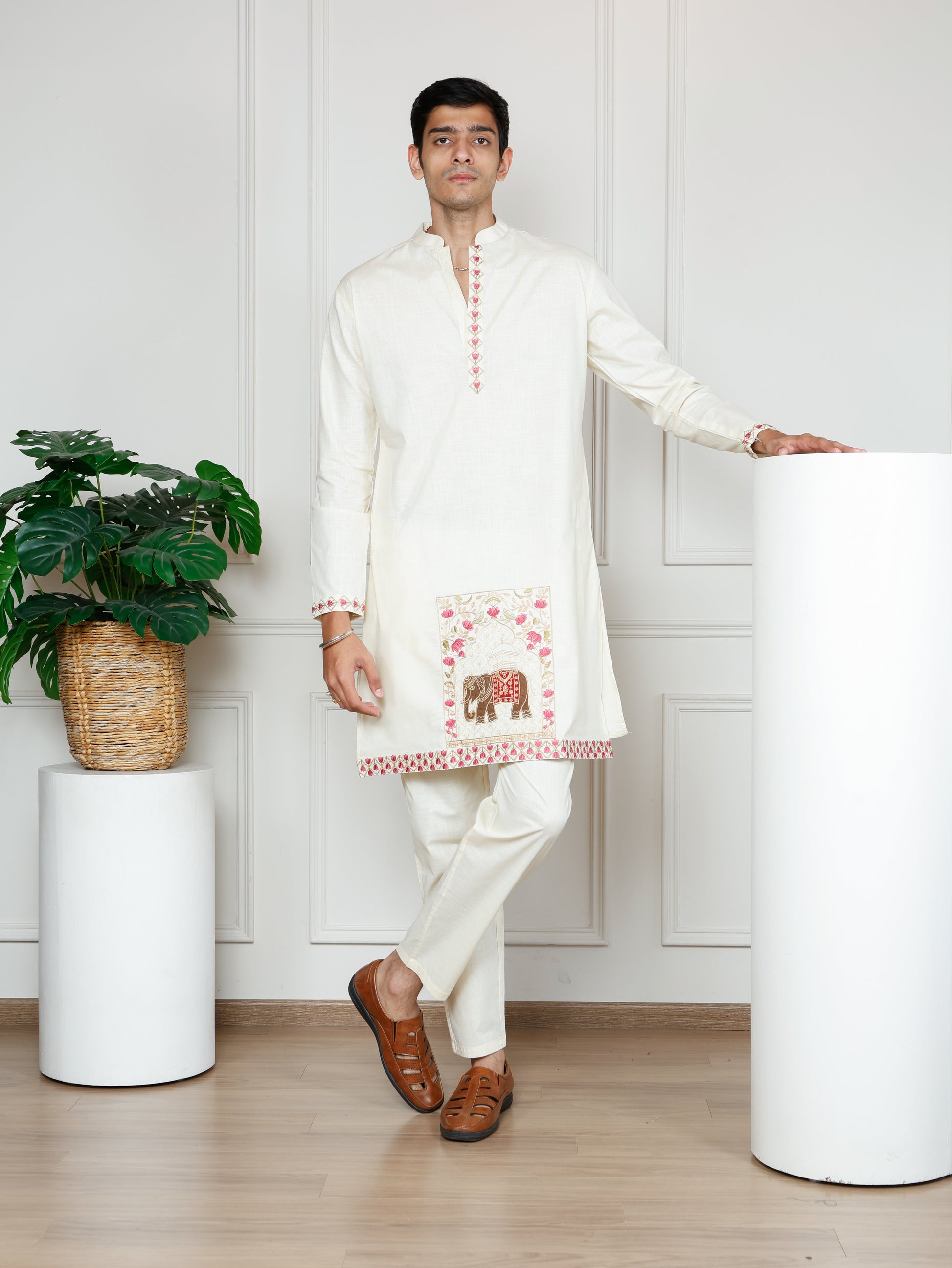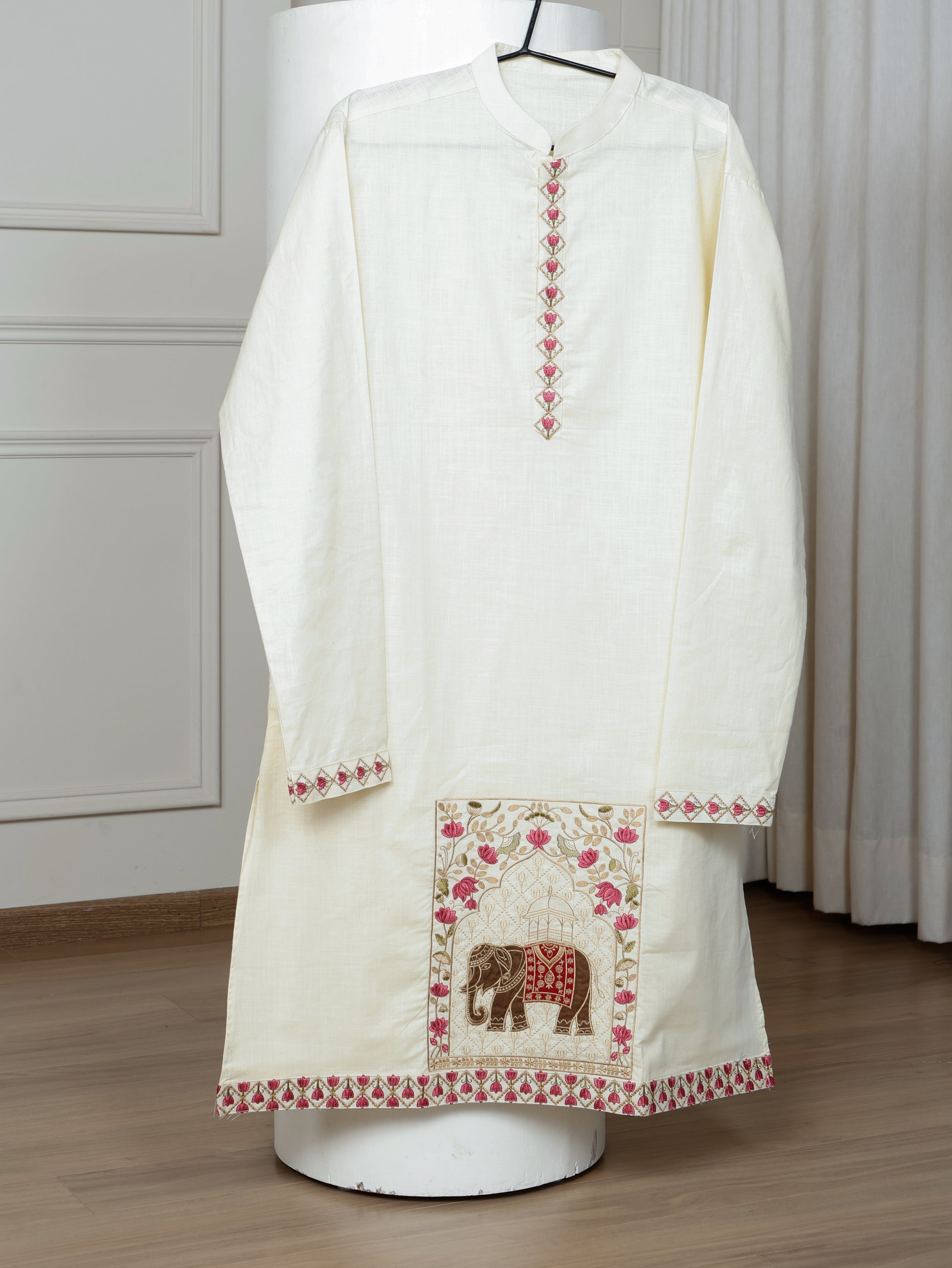 Elegant handcrafted men’s kurta featuring intricate embroidery along the neckline, sleeve edges, and hem. Highlighted with a regal elephant motif framed in traditional floral patterns, this piece blends heritage artistry with contemporary simplicity. The straight-cut silhouette and mandarin collar give it a refined and timeless appeal — perfect for festive occasions, cultural gatherings, or sophisticated celebrations.