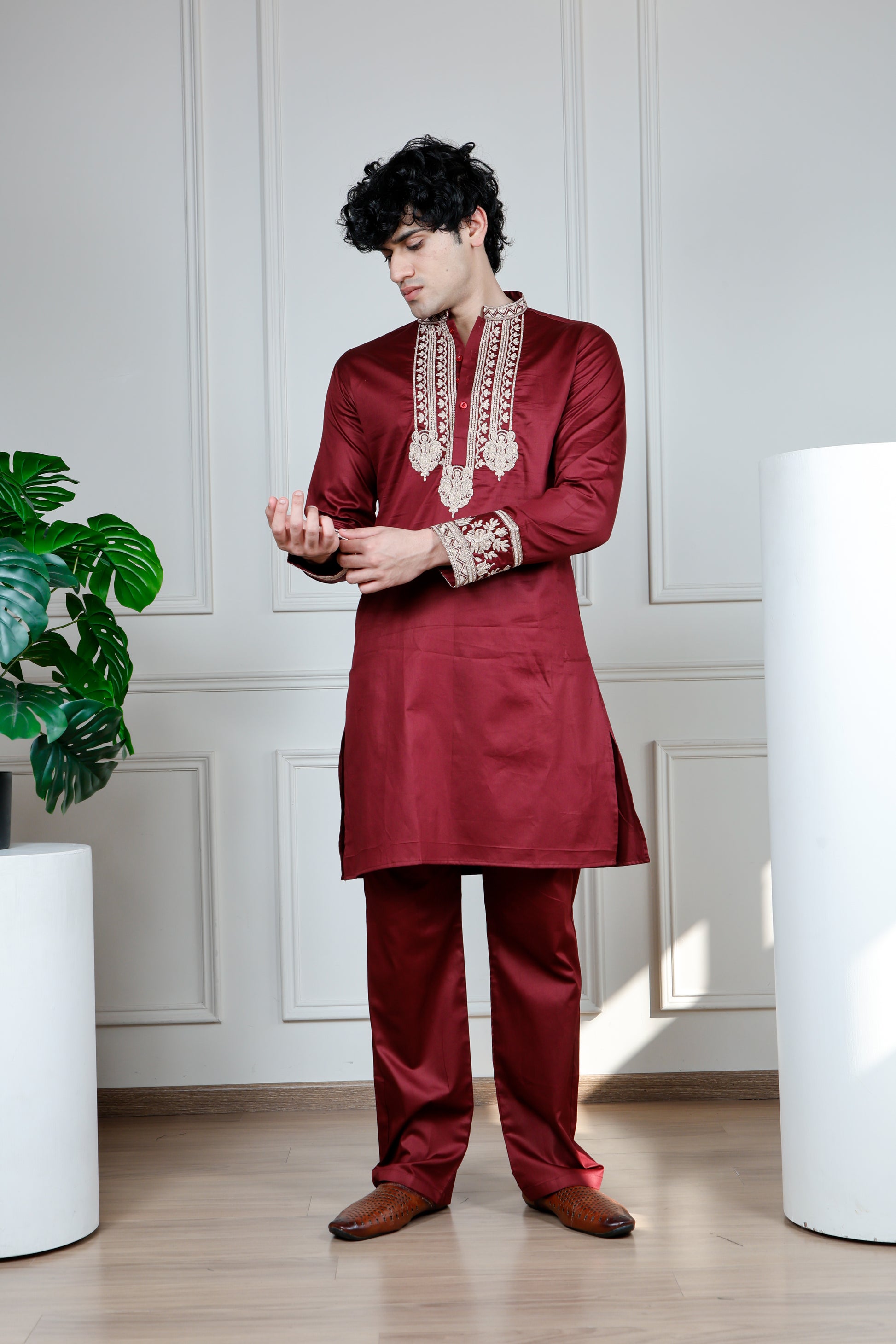 This classic kurta and Pant set features rich, intricate embroidery along the neckline and cuffs, adding a regal touch to its clean and sophisticated silhouette. Designed for comfort yet crafted to make a statement, it pairs perfectly for weddings, celebrations, or refined evening gatherings.