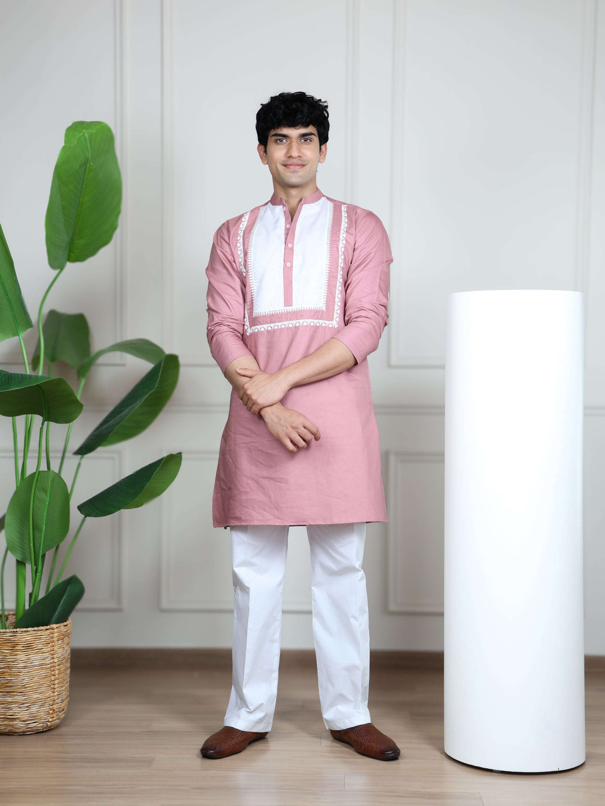 The kurta showcases a striking contrast embroidered front panel with intricate detailing along the neckline and placket, adding depth and sophistication to its straight silhouette. A smart band collar enhances its contemporary appeal, while the tailored straight-fit pants complete the ensemble with a clean, polished look.