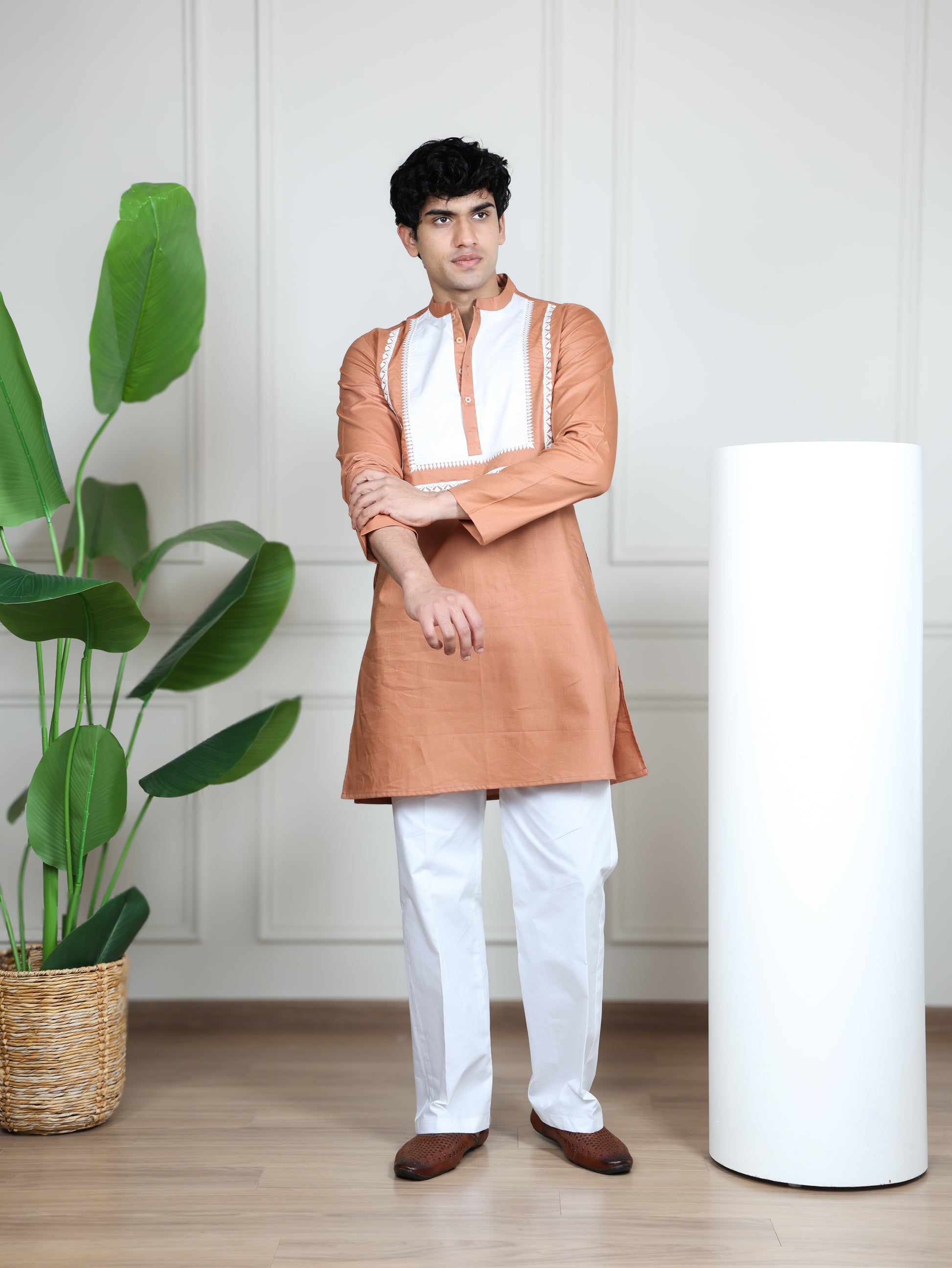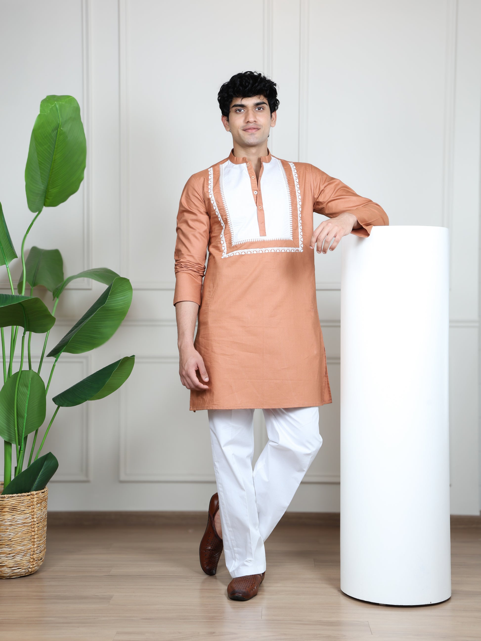 The kurta showcases a striking contrast embroidered front panel with intricate detailing along the neckline and placket, adding depth and sophistication to its straight silhouette. A smart band collar enhances its contemporary appeal, while the tailored straight-fit pants complete the ensemble with a clean, polished look.