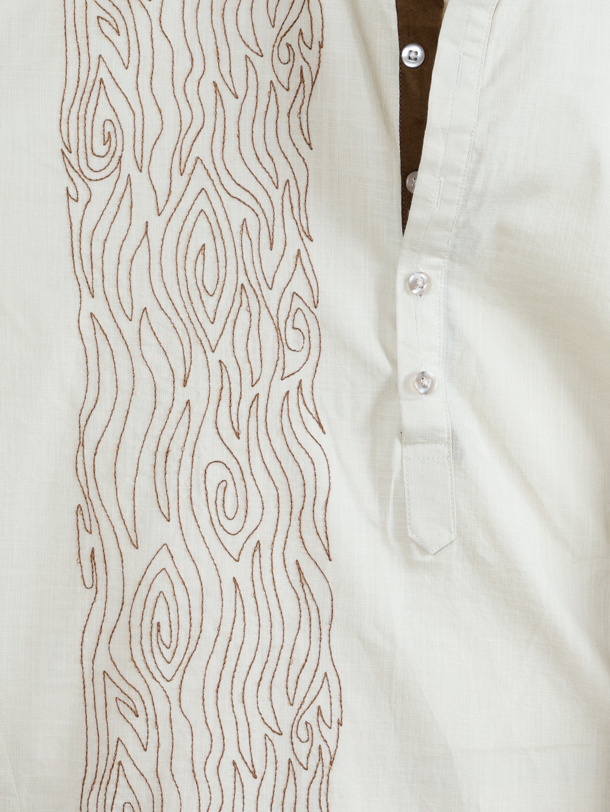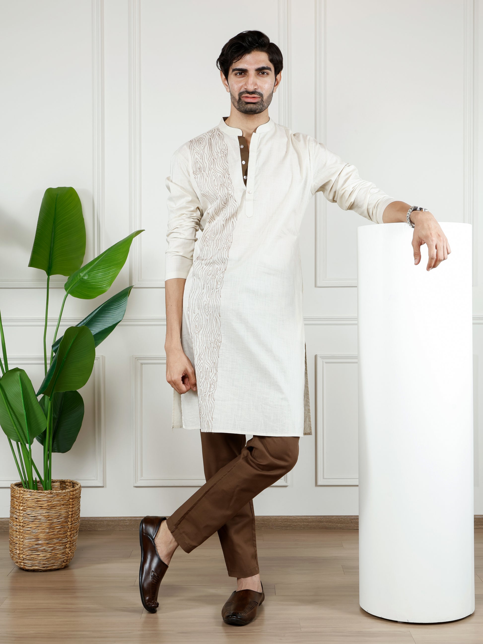 The Ivory Waves Kurta is a traditional yet contemporary piece crafted from lightweight, breathable fabric. It features an elegant off-white hue complemented by intricate, wave-inspired embroidery running vertically along one side of the front panel. The kurta has a contrasting brown placket with buttons, adding a subtle yet striking detail to its classic design.