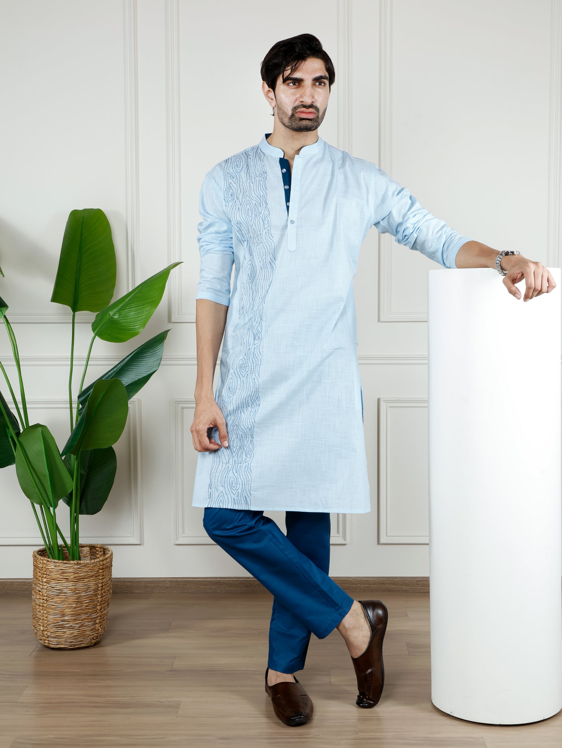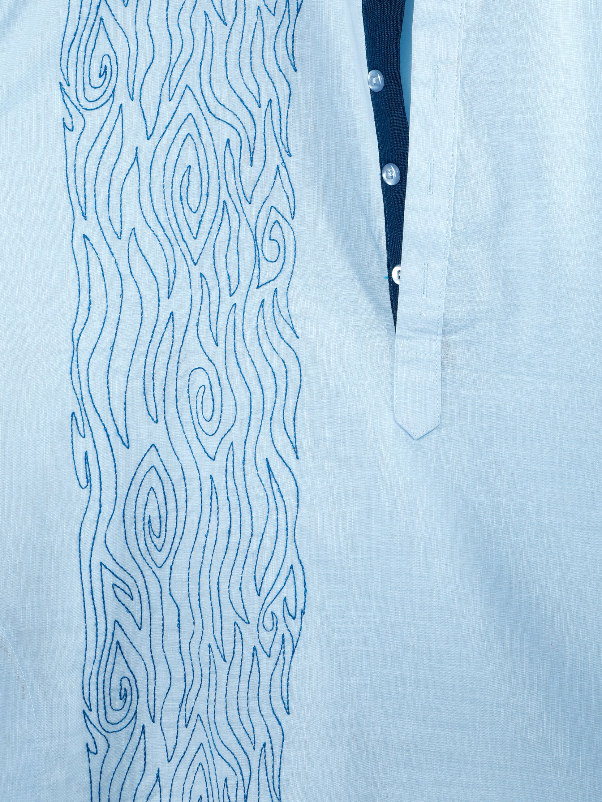 The Light blue Waves Kurta is a traditional yet contemporary piece crafted from lightweight, breathable fabric. It features an elegant light blue hue complemented by intricate, wave-inspired embroidery running vertically along one side of the front panel. The Kurta has a contrasting dark blue placket with buttons, adding a subtle yet striking detail to its classic design.
