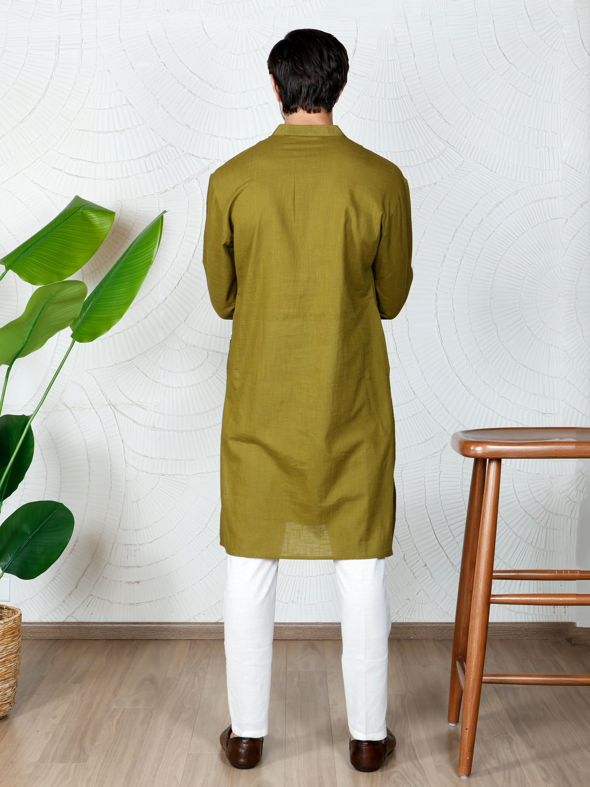 Make a statement in understated elegance with this Mehendi Green Chikankari Kurta for men. Tailored from rich handloom cotton, this Kurta showcases a Mehendi green colour adorned with uniform white floral motifs, giving it a bold yet refined appearance.