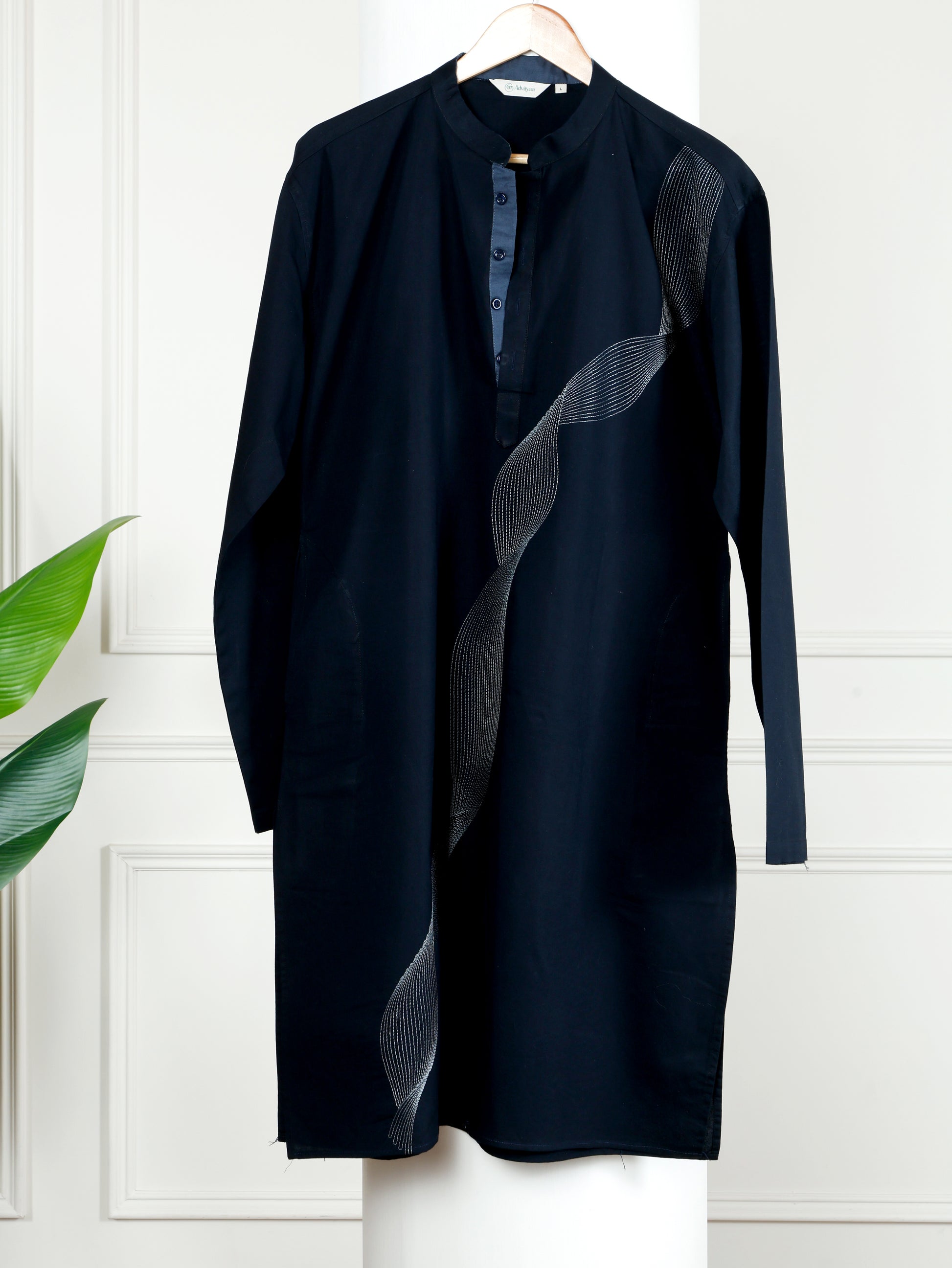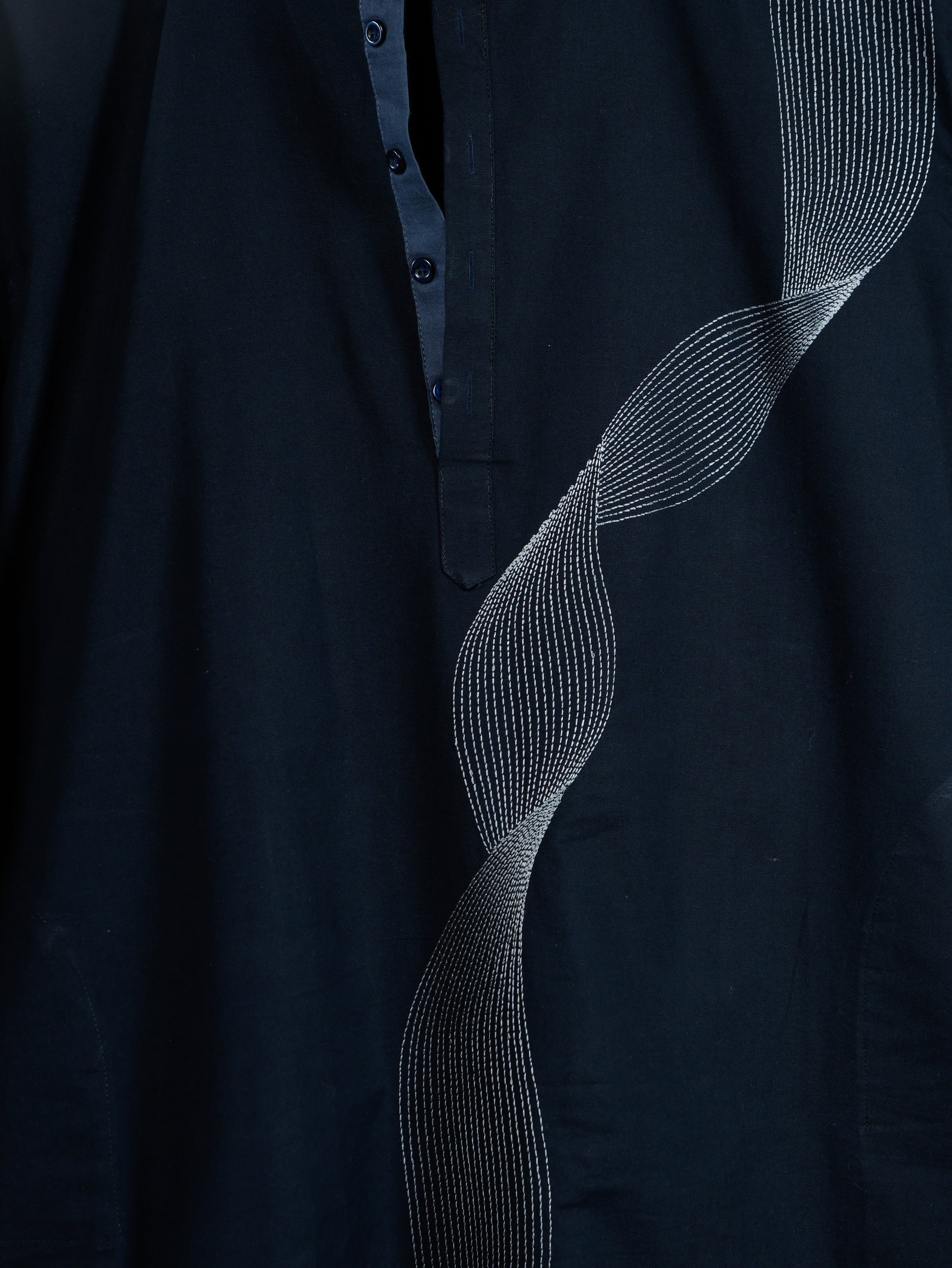 This elegant midnight blue Kurta and pant set features a contemporary steel grey wave embroidery that flows diagonally across the front, adding a sophisticated touch. The kurta is designed with a mandarin collar, contrasting grey placket with buttons, and full sleeves. The kurta has a mandarin collar and buttons that enhance its traditional appeal. This ensemble is ideal for cultural events, festive occasions, or casual gatherings.