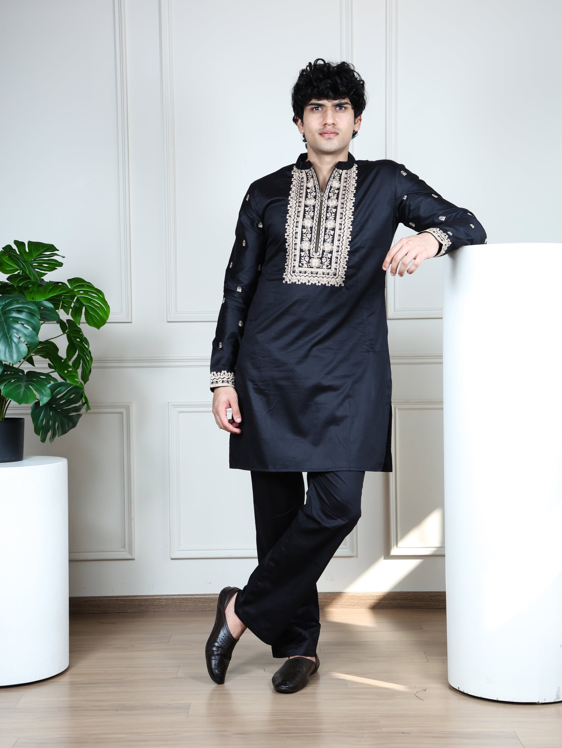 Crafted in premium cotton, this kurta brings together tradition and comfort in the most effortless way. The beautifully detailed front panel is adorned with intricate thread embroidery, giving it a rich, festive appeal perfect for weddings, celebrations, and cultural gatherings. Subtle embroidered motifs on the sleeves add a refined touch, while the tailored silhouette ensures a sharp, clean look. Soft on the skin, breathable, and elevated with artisan detailing — this is a timeless piece designed to make every moment feel special.