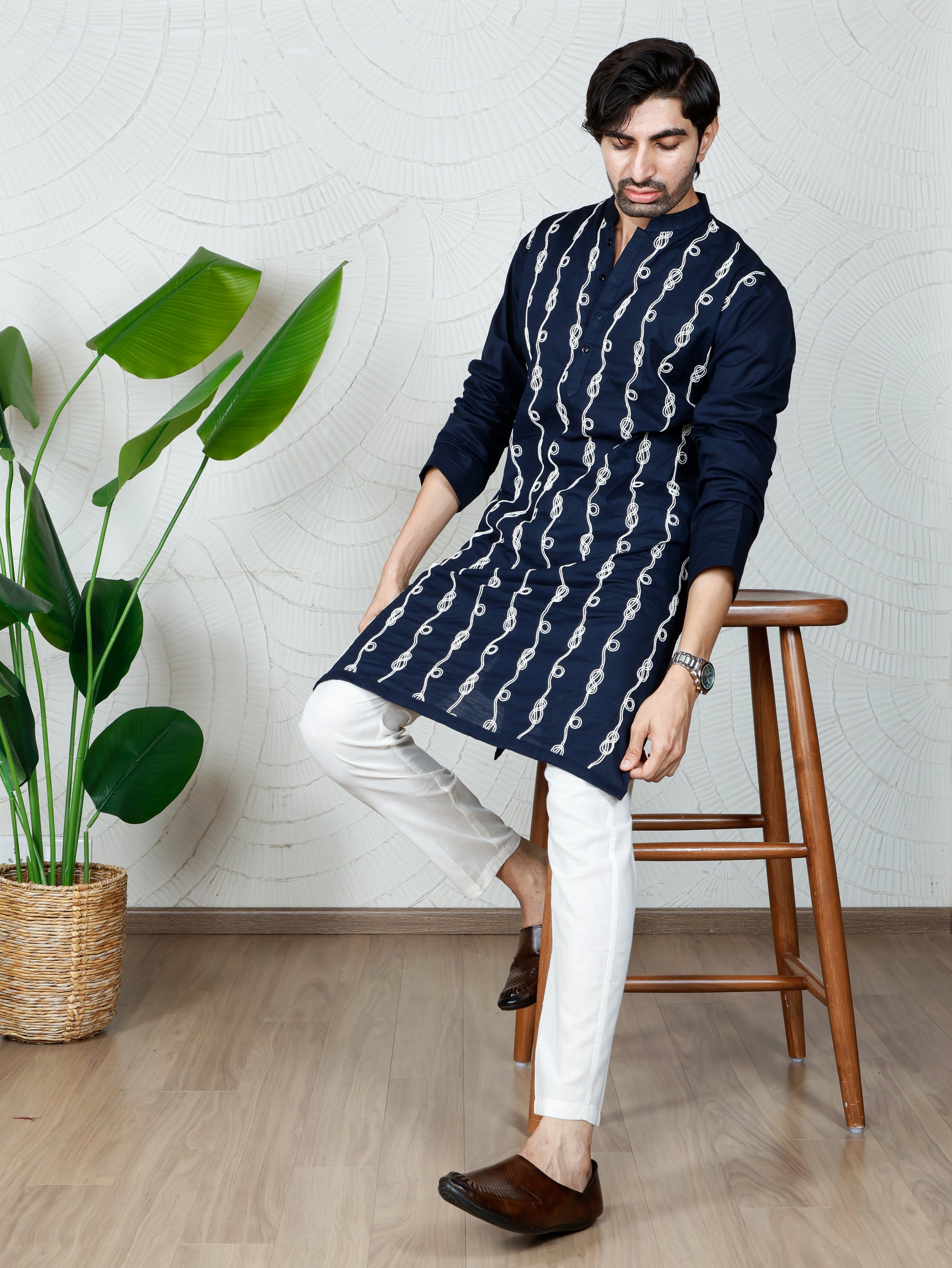This men's kurta-pant set features a navy blue kurta embellished with vertical white thread embroidery, showcasing intricate looped circular patterns along wavy lines. The kurta includes a mandarin collar, a buttoned placket, and full sleeves, offering a sophisticated straight-cut silhouette. This set is perfect for festive occasions, cultural celebrations, and traditional gatherings.