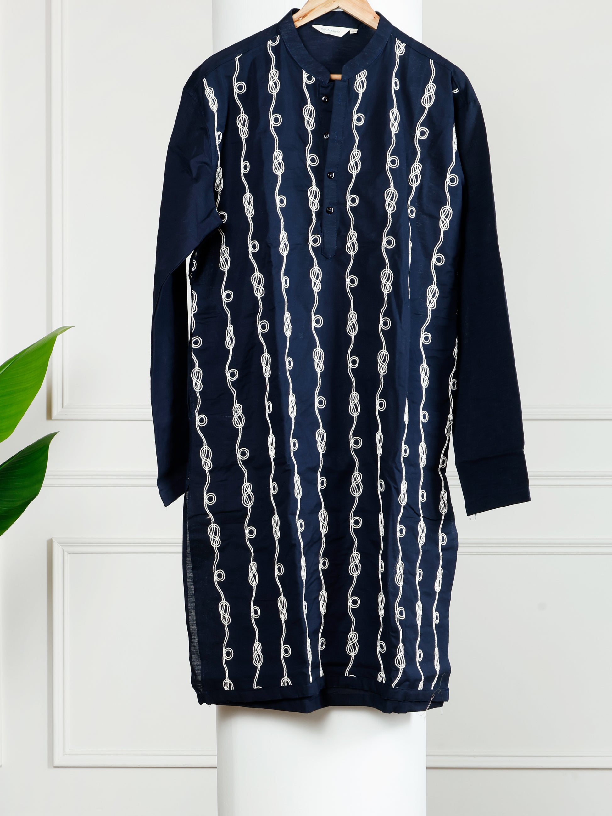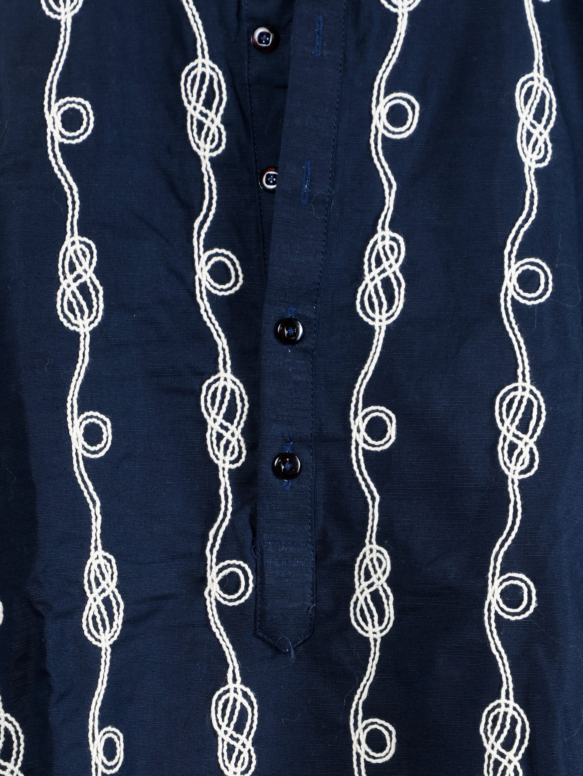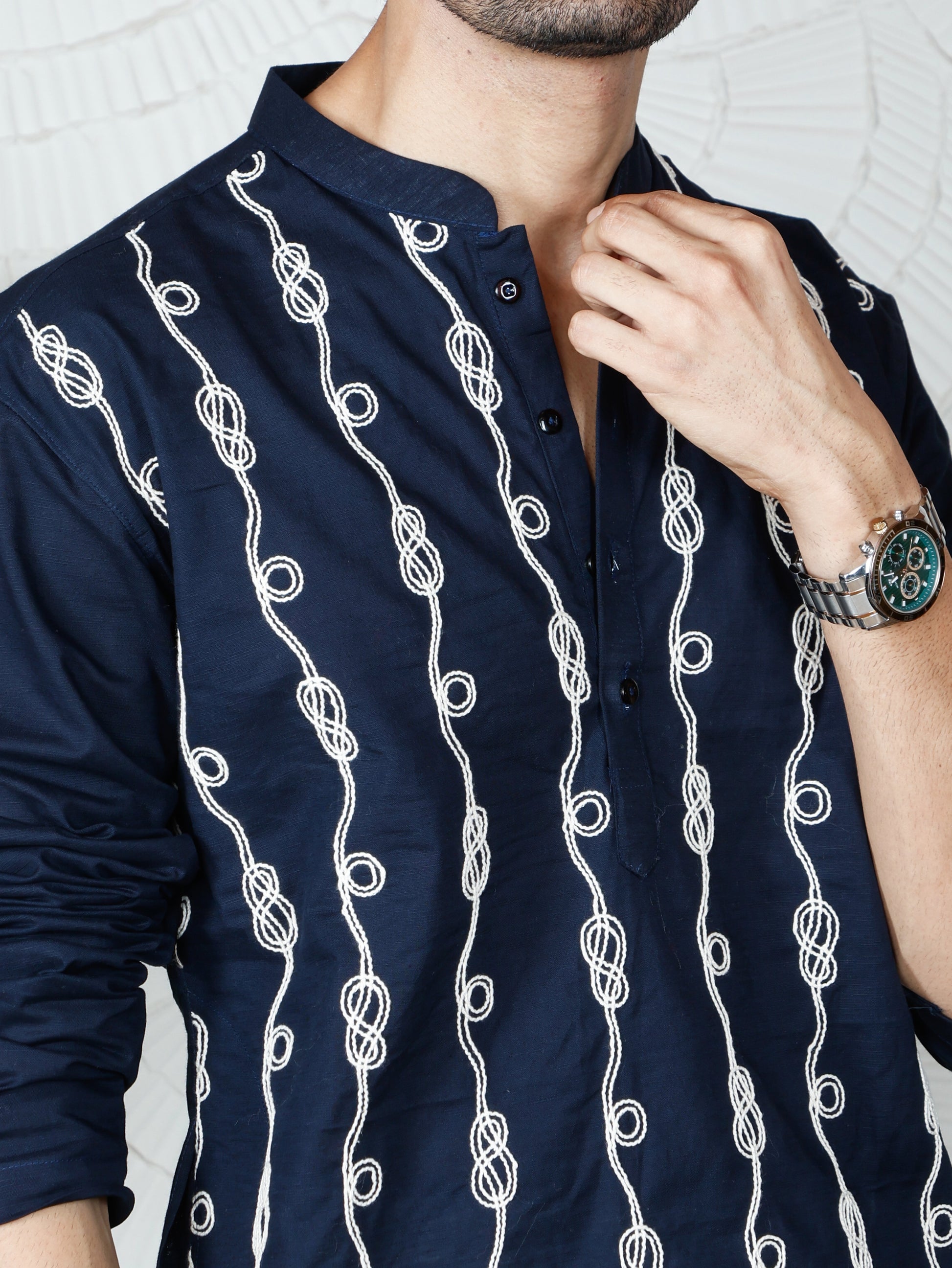 This men's kurta-pant set features a navy blue kurta embellished with vertical white thread embroidery, showcasing intricate looped circular patterns along wavy lines. The kurta includes a mandarin collar, a buttoned placket, and full sleeves, offering a sophisticated straight-cut silhouette. This set is perfect for festive occasions, cultural celebrations, and traditional gatherings.