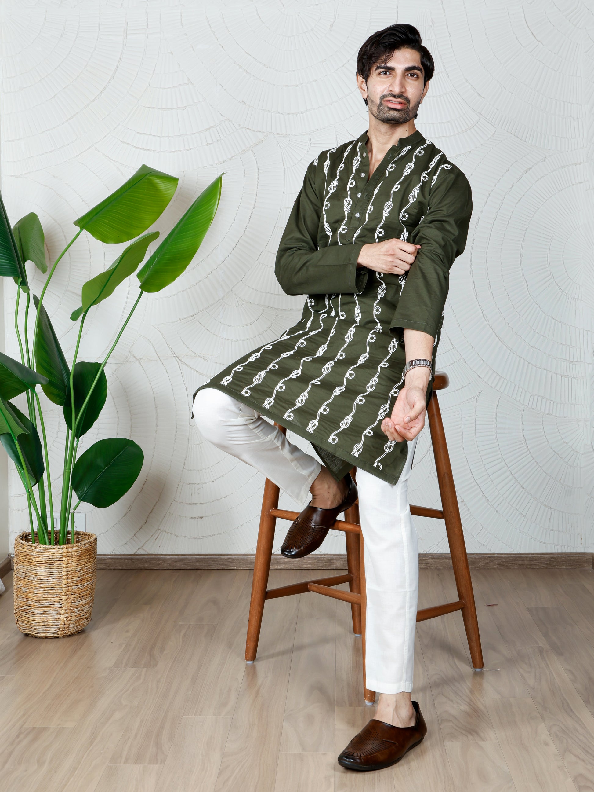 This men's kurta-pant set features a Olive Kurta embellished with vertical white thread embroidery, showcasing intricate looped circular patterns along wavy lines. The Kurta includes a mandarin collar, a buttoned placket, and full sleeves, offering a sophisticated straight-cut silhouette. This set is perfect for festive occasions, cultural celebrations, and traditional gatherings.