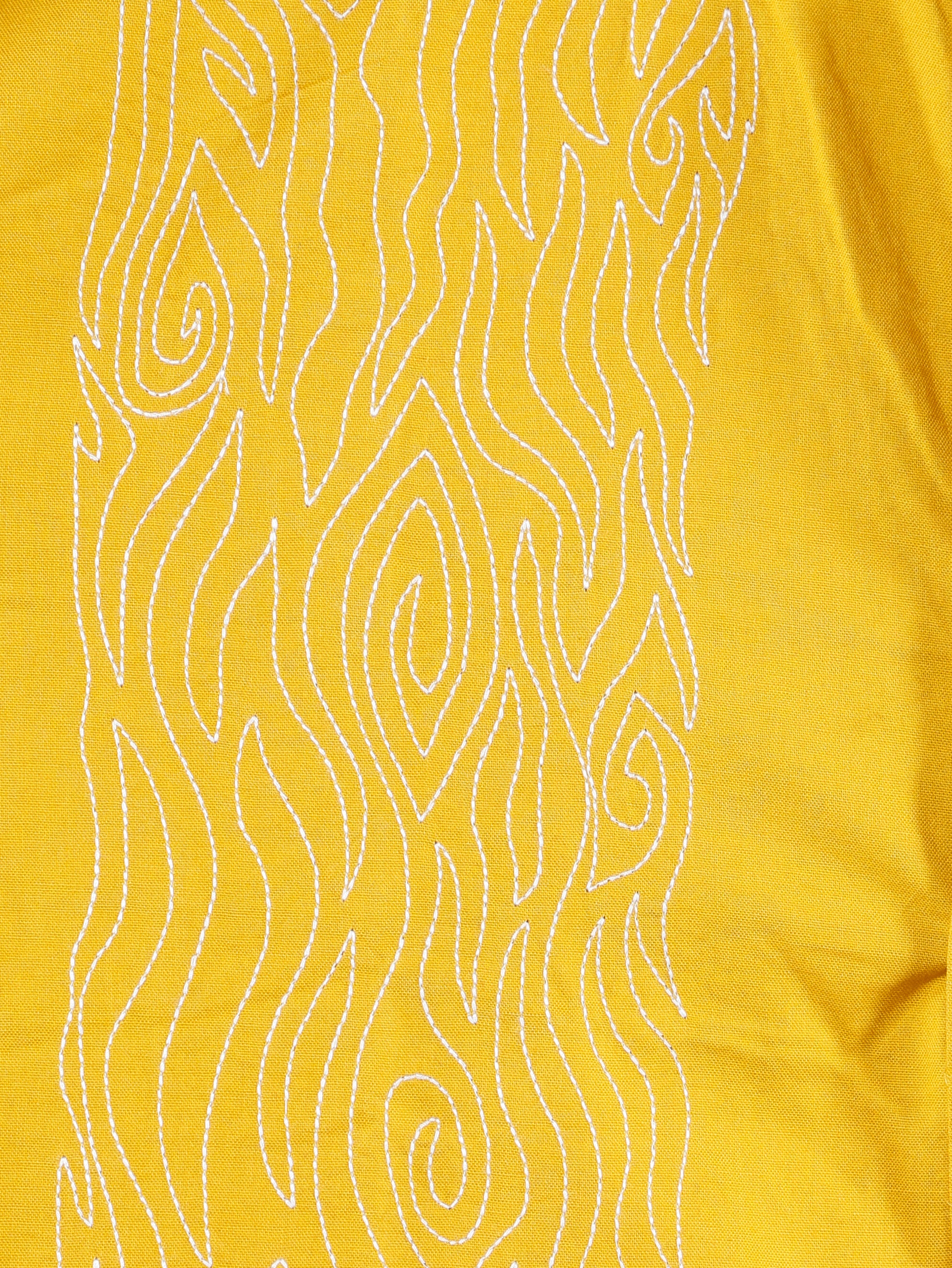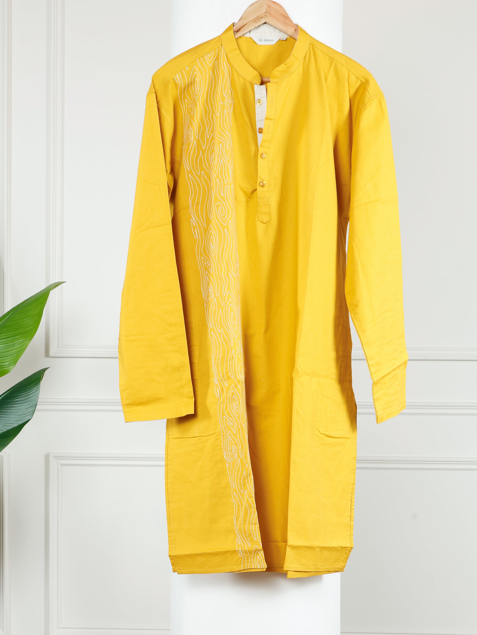 The Yellow Waves Kurta is a traditional yet contemporary piece crafted from lightweight, breathable fabric. It features an elegant yellow colour hue complemented by intricate, wave-inspired embroidery running vertically along one side of the front panel. The kurta has a contrasting white placket with buttons, adding a subtle yet striking detail to its classic design.