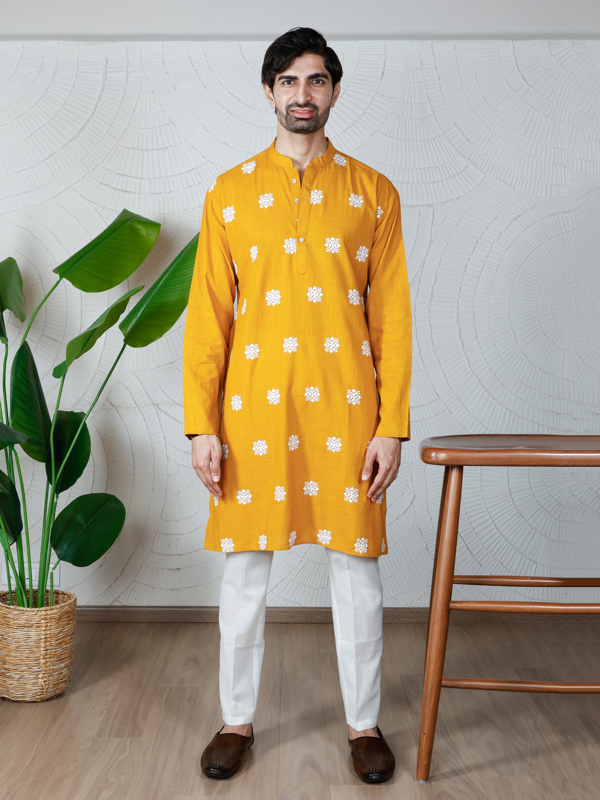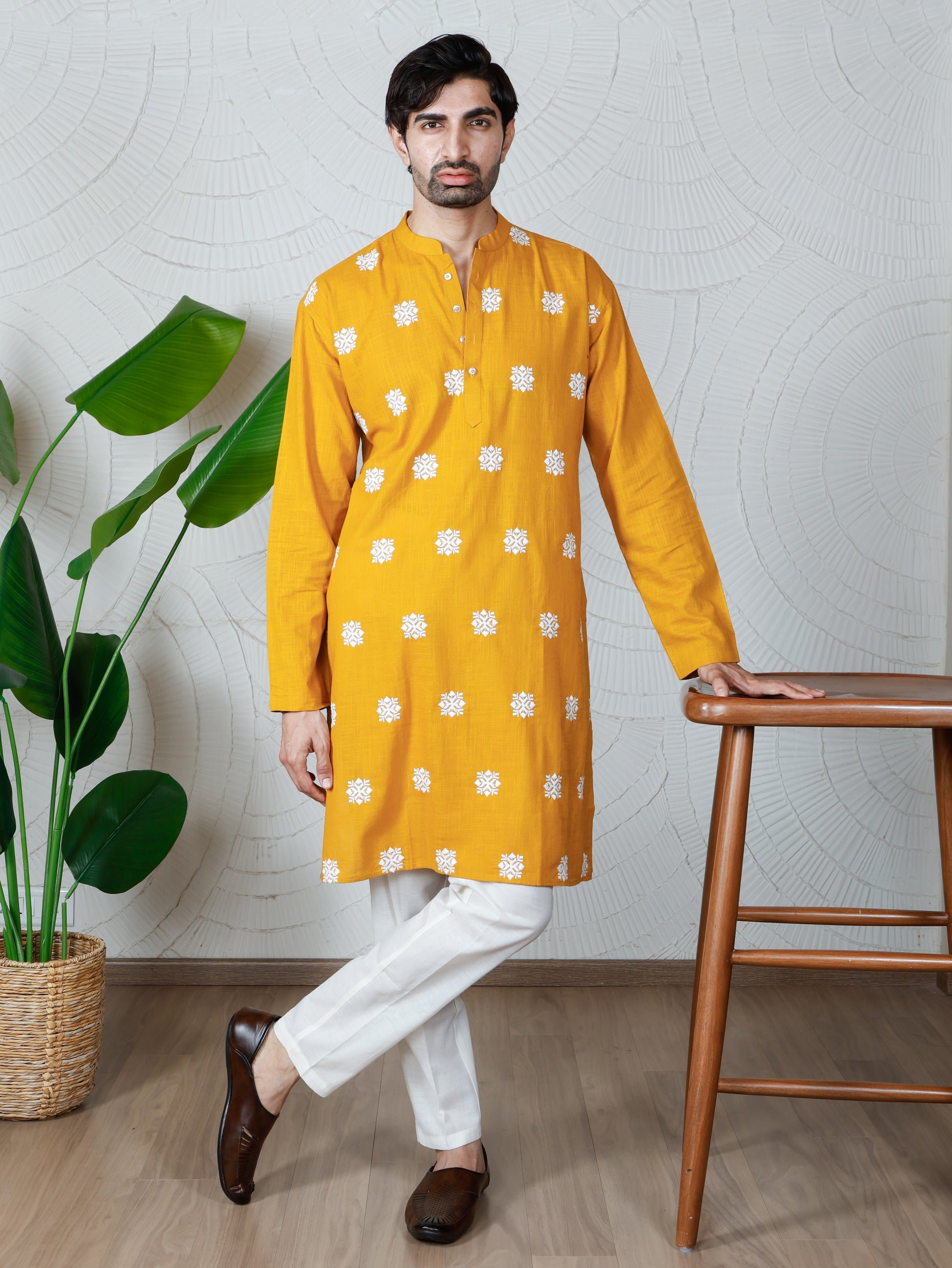 Make a statement in understated elegance with this Sunshine Yellow Chikankari Kurta for men. Tailored from rich handloom cotton, this kurta showcases a Sunshine Yellow adorned with uniform white floral motifs, giving it a bold yet refined appearance.