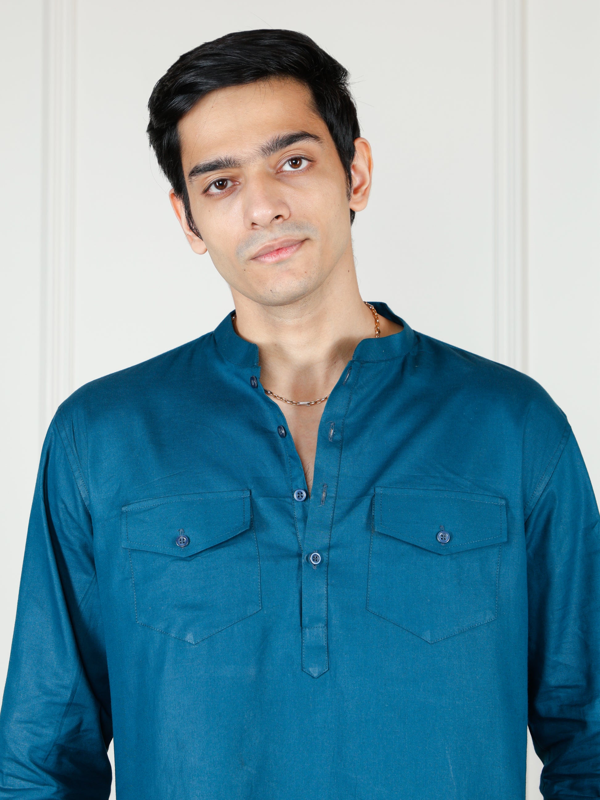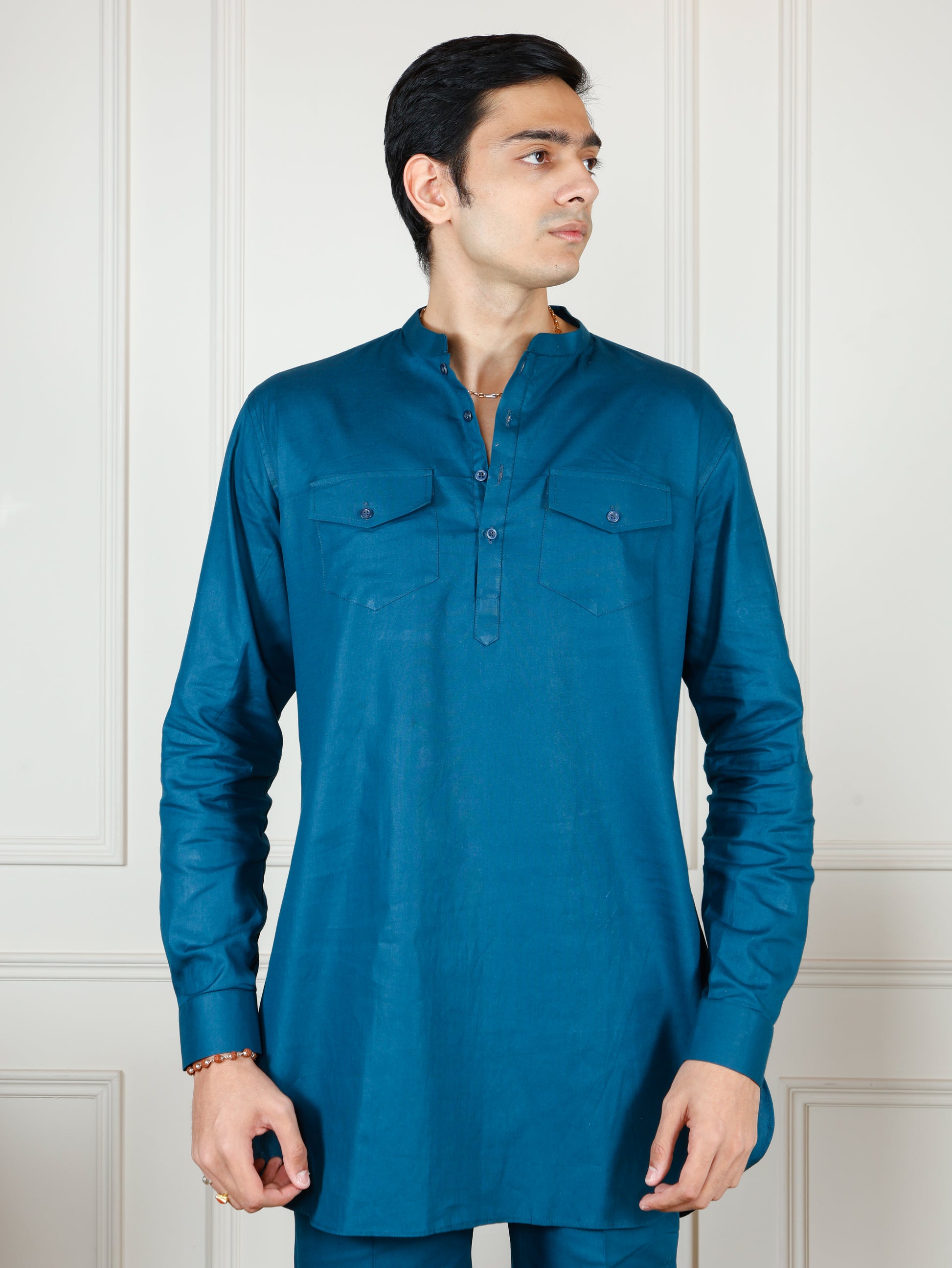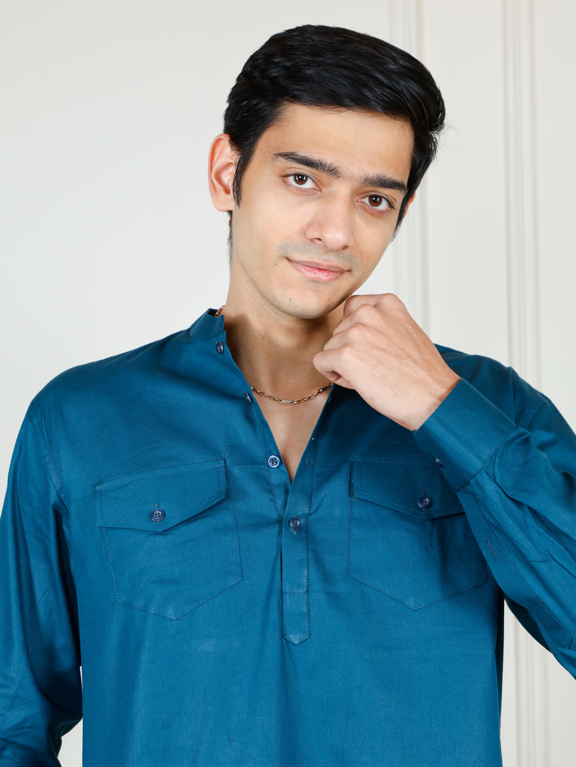 The kurta features a classic mandarin collar, a half-button placket, full sleeves, and two smartly designed flap pockets, combining traditional charm with contemporary design. Paired with straight-cut trousers, this ensemble offers a sharp, elegant look ideal for festive occasions, casual gatherings, or stylish everyday wear.