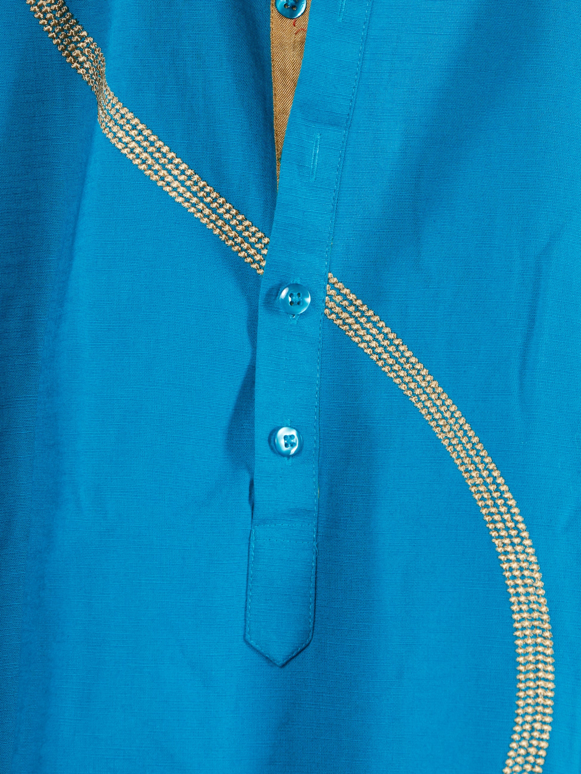 This is a kurta from the brand "Advityaa," featuring a mandarin collar with a buttoned placket and contrasting mustard yellow detailing along the neckline. The Kurta is turquoise with a distinctive mustard yellow embroidered swirl pattern, adding a modern flair to its traditional design.