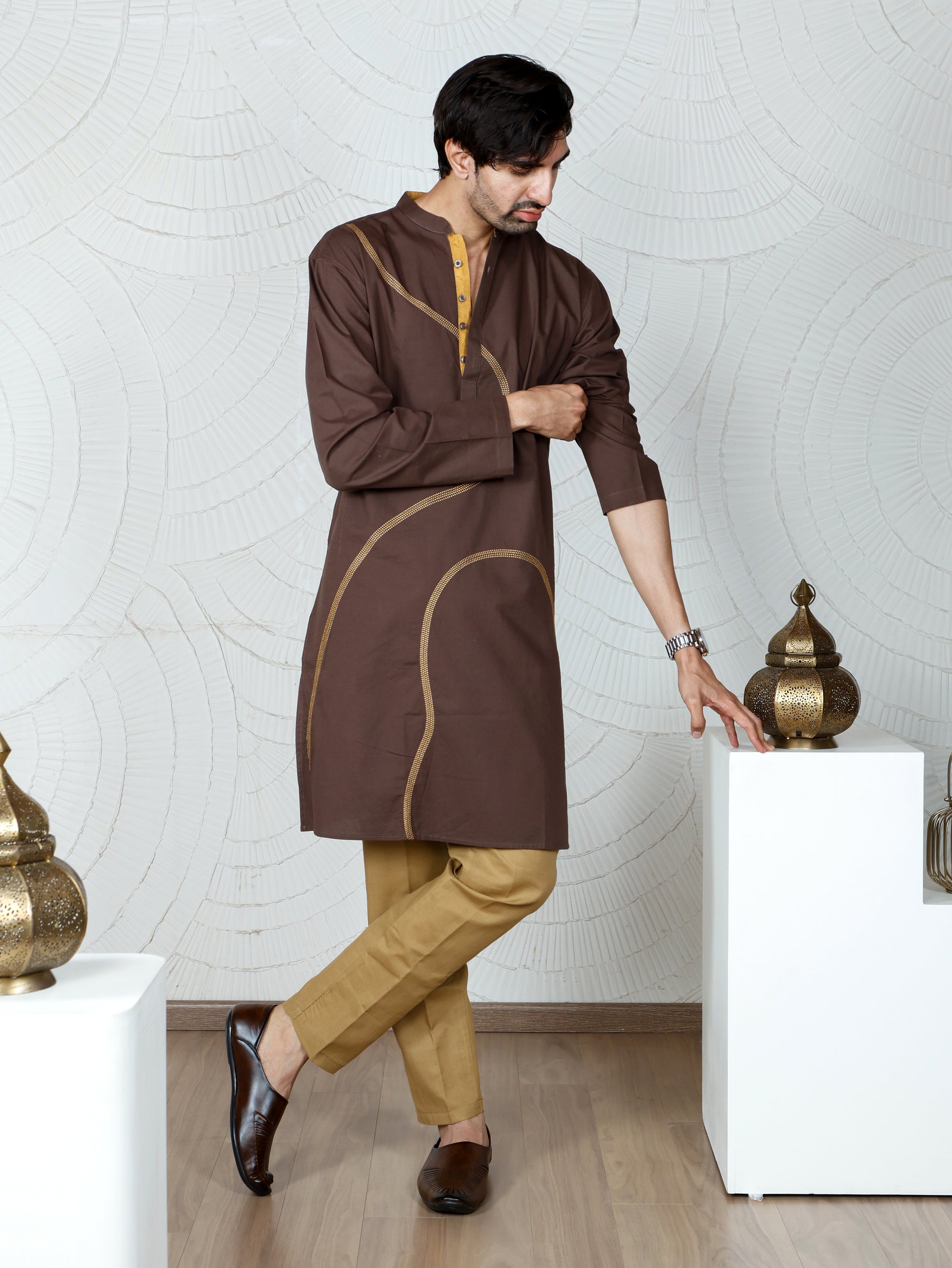 This is a kurta set is from the brand "Advityaa," featuring a mandarin collar with a buttoned placket and contrasting mustard yellow detailing along the neckline. The kurta is in walnut color with a distinctive mustard yellow embroidered swirl pattern, adding a modern flair to its traditional design.